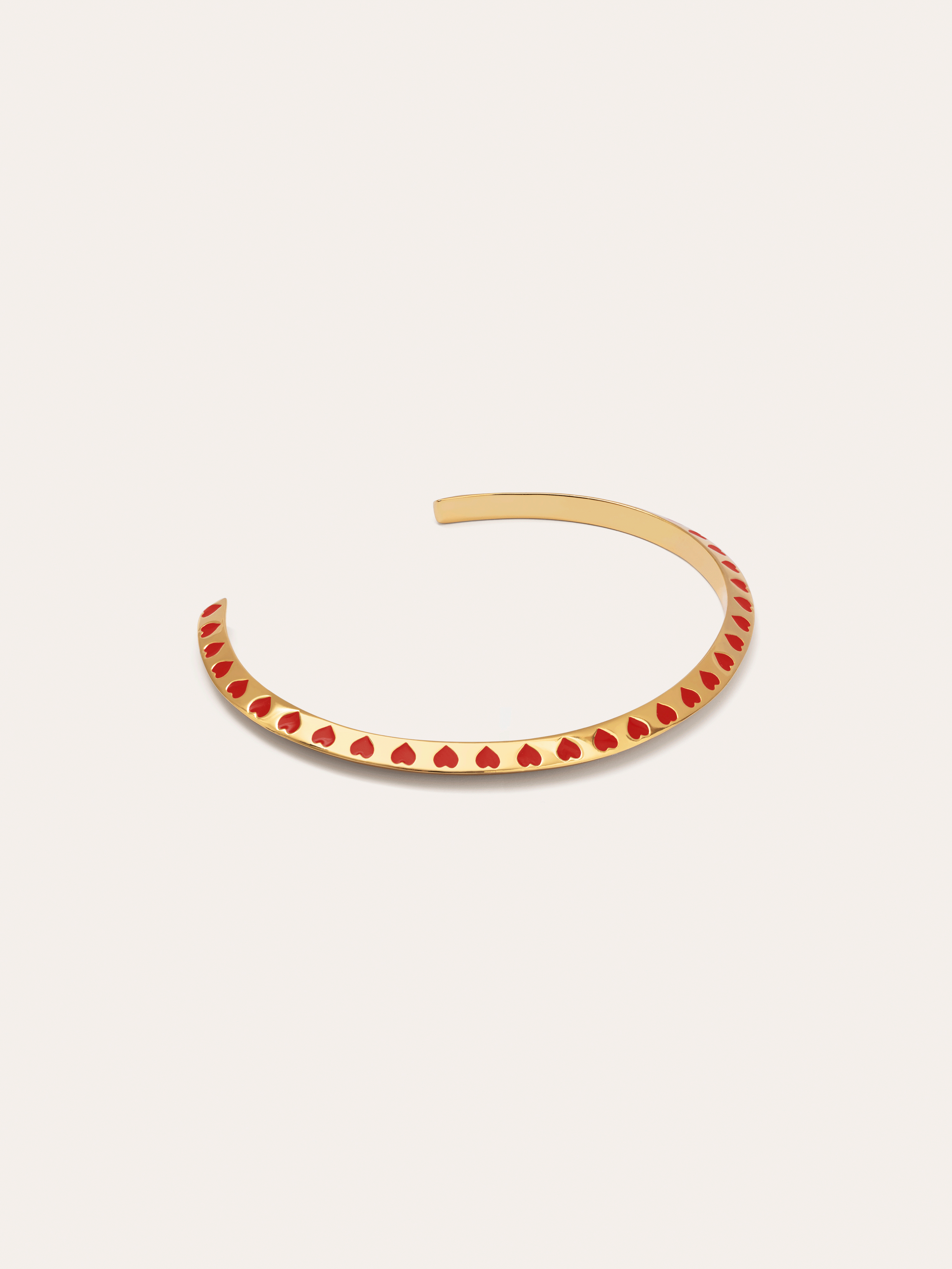 El Brazalete Amour es perfecto para las amantes de las joyas con corazones. Un brazalete semi abierto y ajustable con mini corazones rojos por un lado de la joya. ❤️
