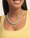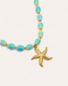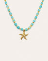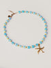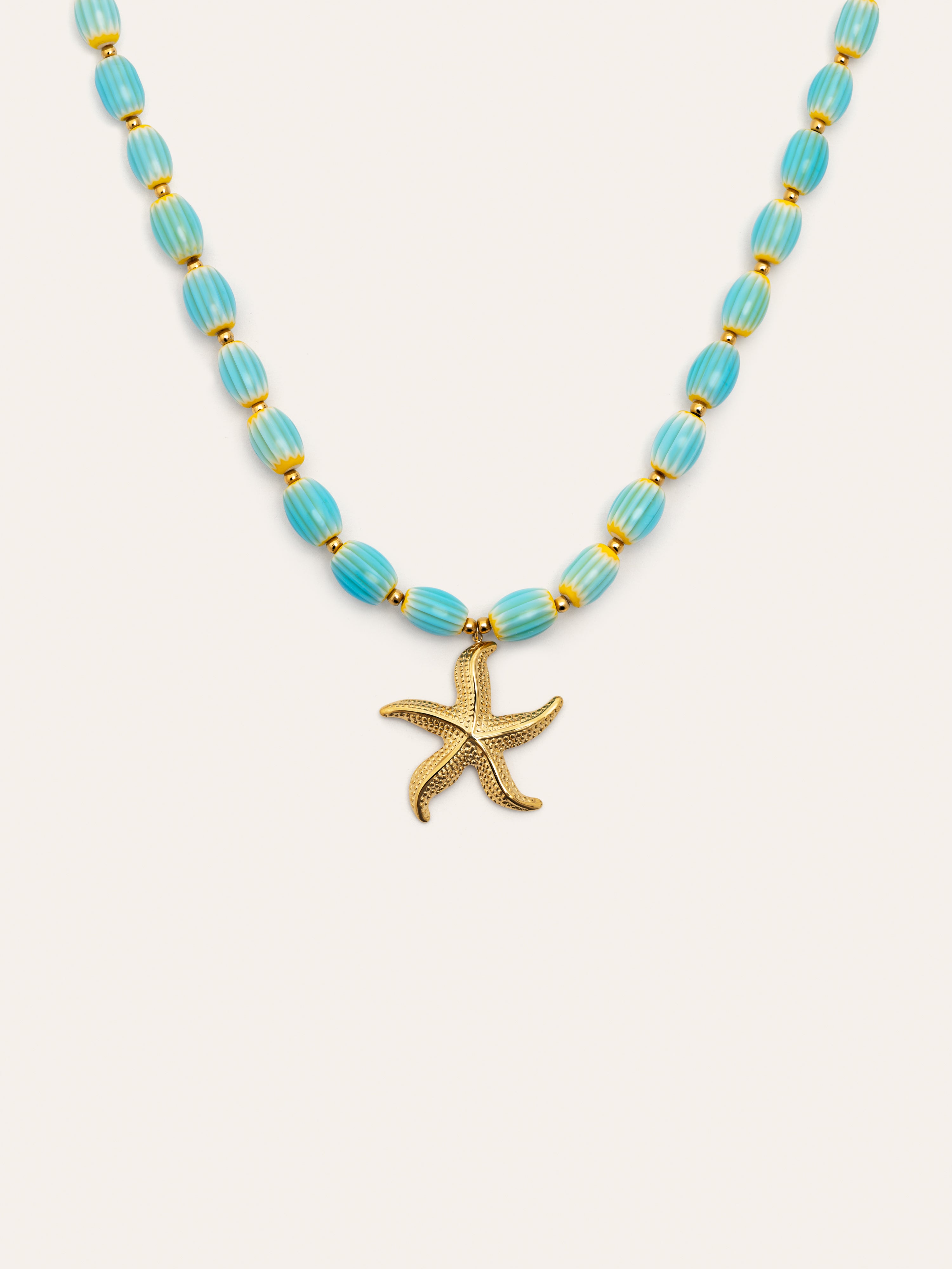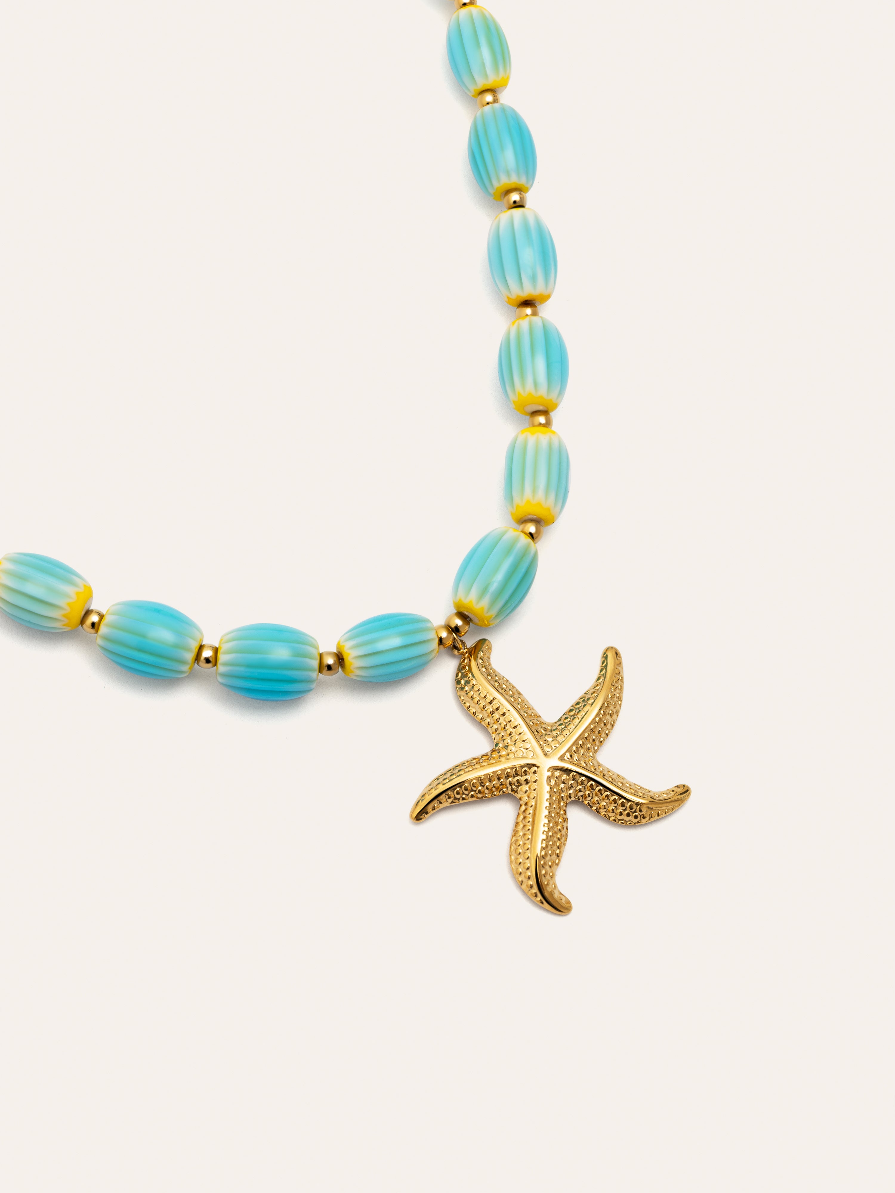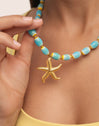 El Collar Ariel Colors de acero inoxidable bañado en oro con cuentas maxi azules y amarillas. Con un charm colgante de estrella de mar es perfecto para tus looks playeros o festivaleros.