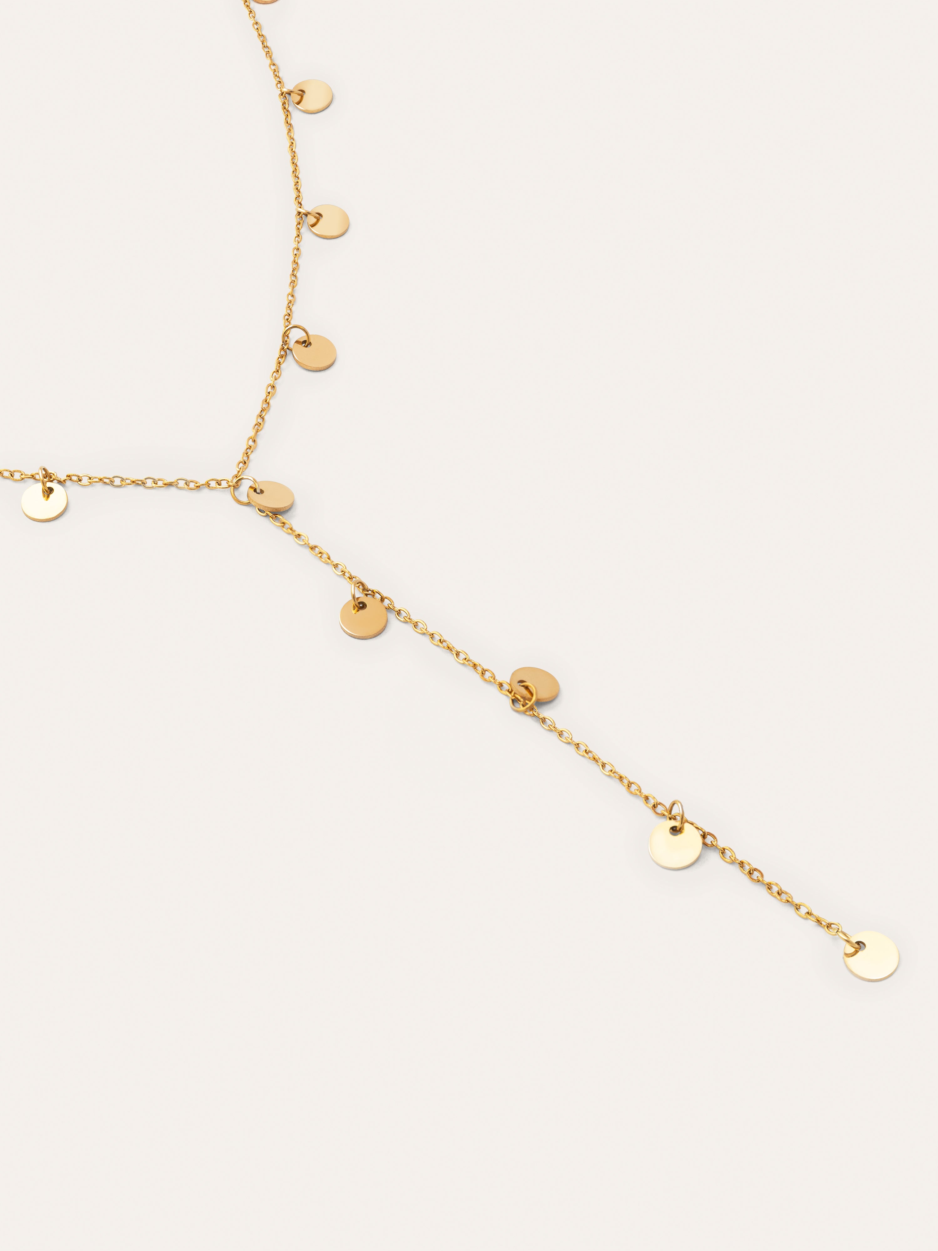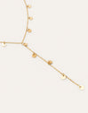 El collar Mini Moon en forma de Y con mini moons es perfecto para escotes en pico. Un colgante de acero bañado en Oro de 18kt perfecto para un evento especial. ✨ Una joya de la colección Souvenirs.