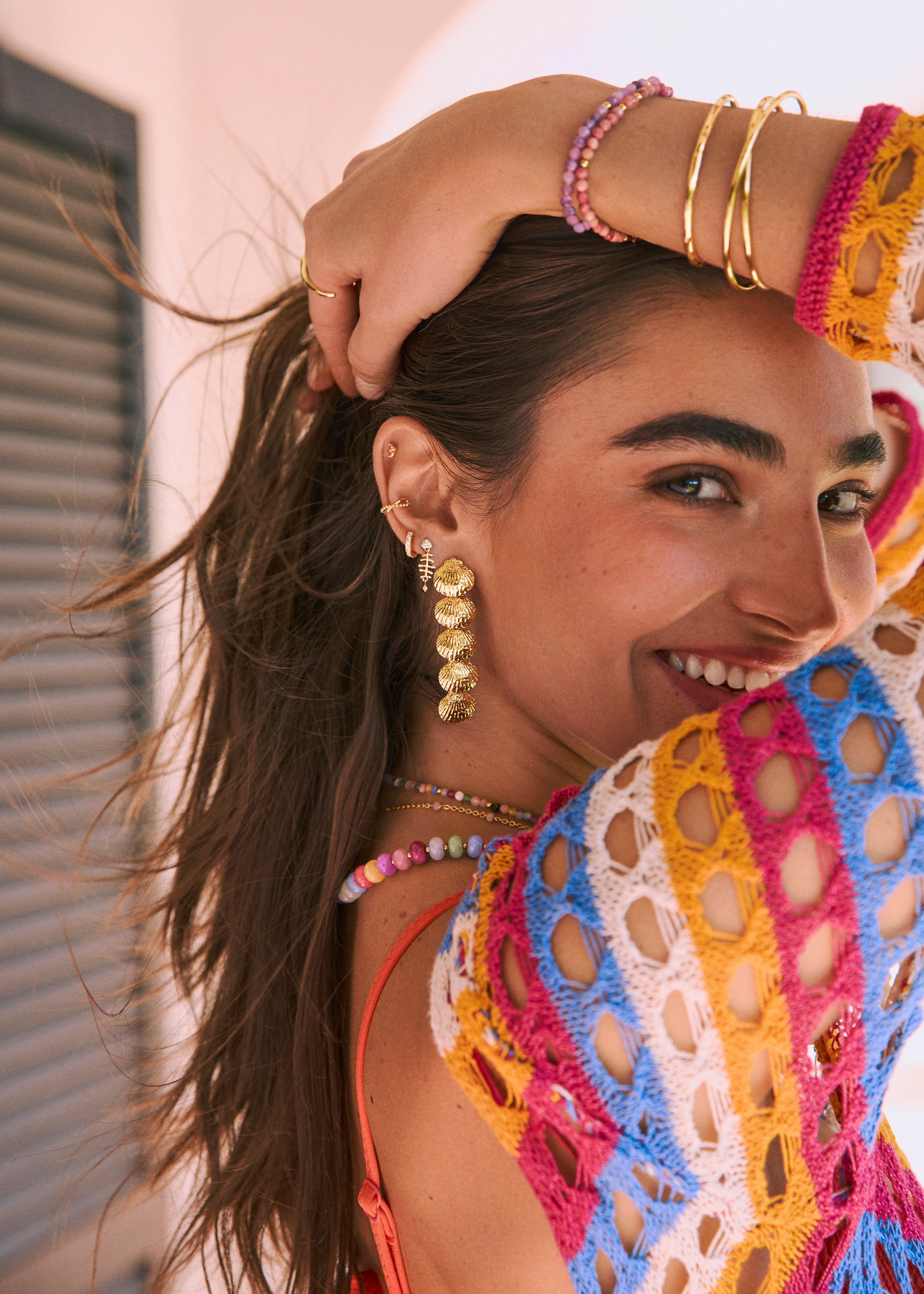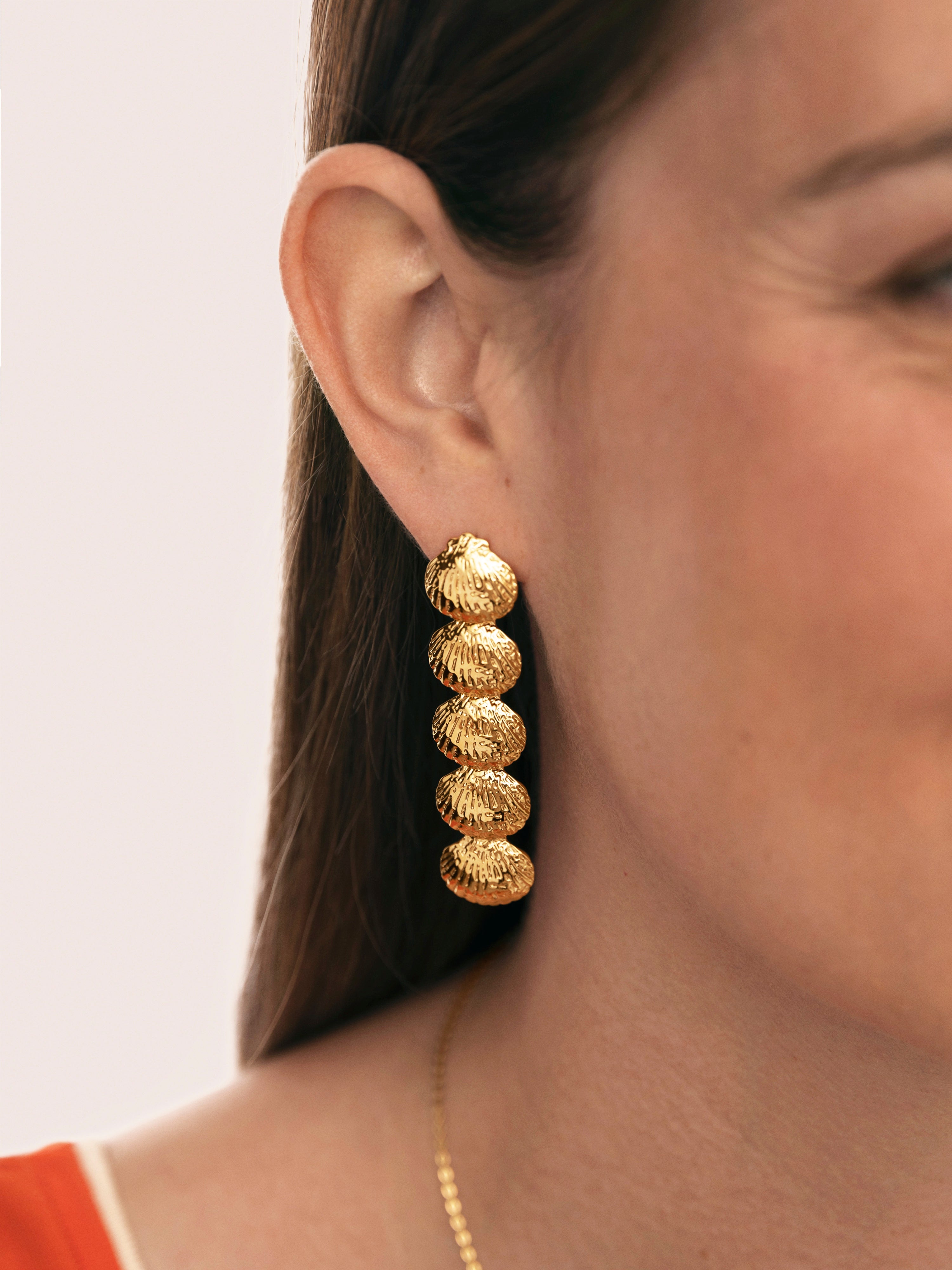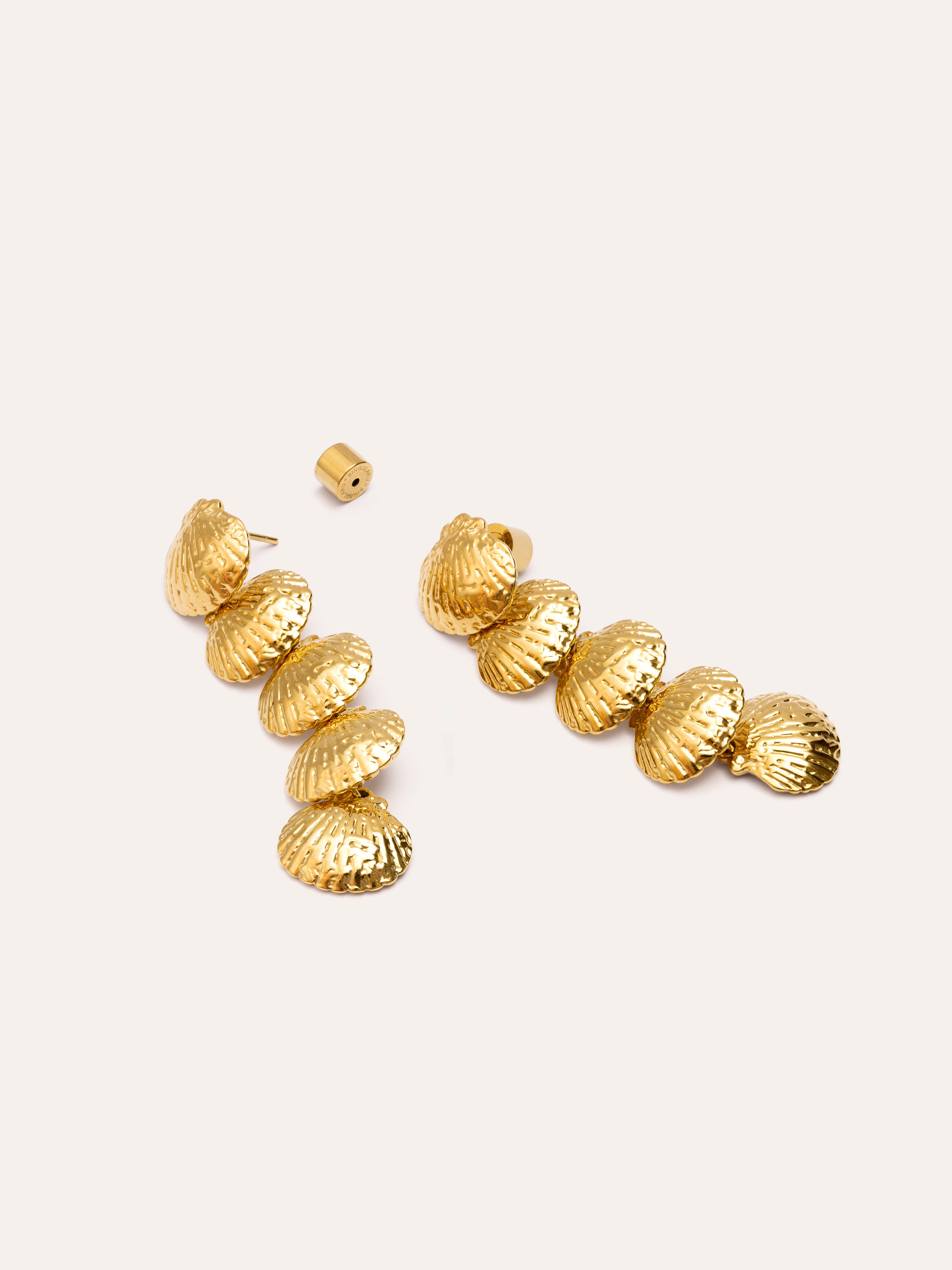 Los Pendientes Long Maris de acero bañados en oro son unos pendientes colgantes de cinco conchas en cascada. Su textura aporta volumen y mucha sofisticación a todos tus looks. Son los pendientes largos y colgantes ideales para tu próximo evento. 🐚