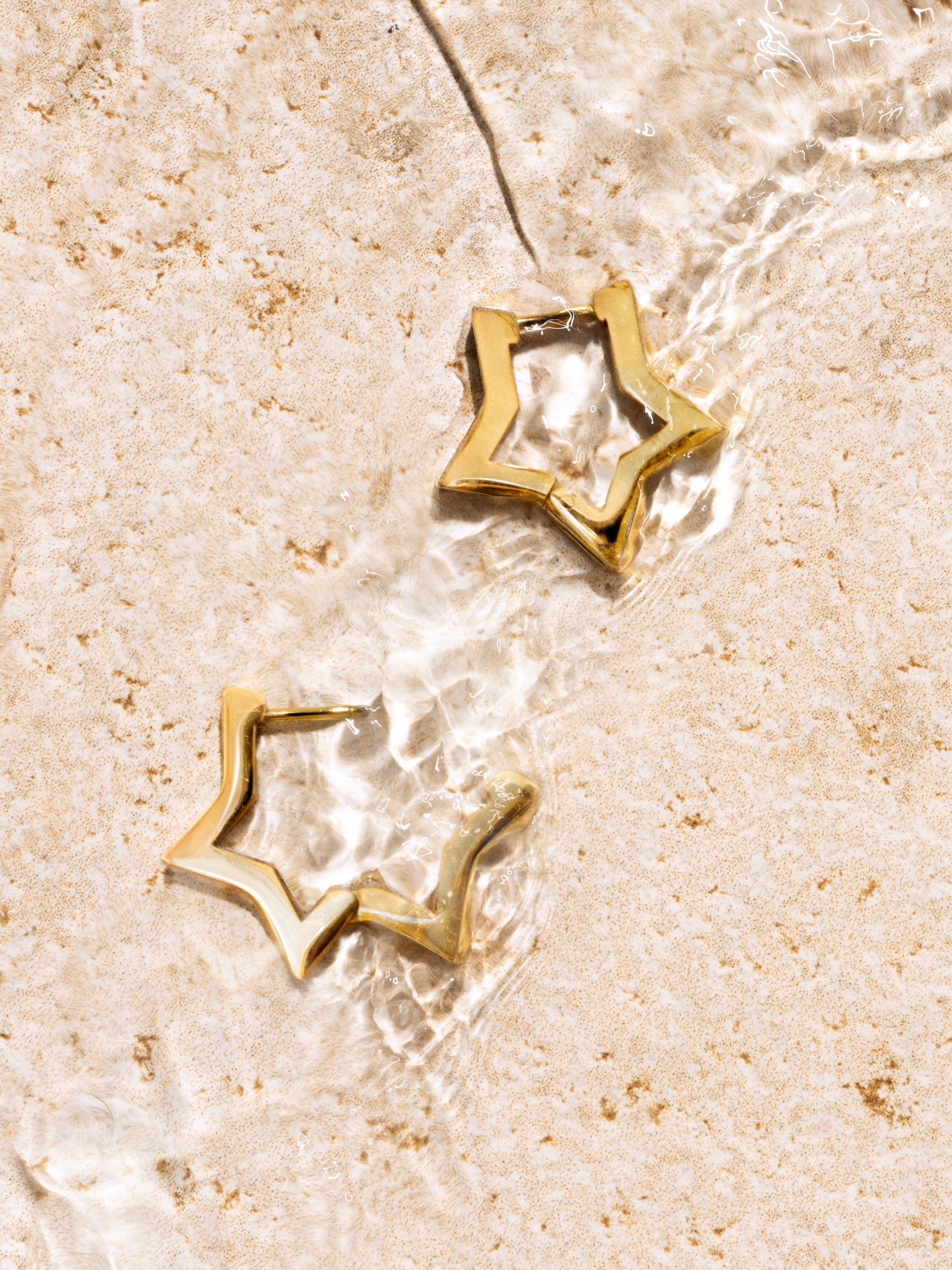 Estos pendientes de aro en forma de estrella, son para verdaderas Superstars. Añade estos pendientes de acero bañados en oro de 18kt a tu ear-look para formar combinaciones de otro mundo ✨ Hazte con los pendientes que ha lucido S.M la Reina Letizia y añade un toque elegante a tu look. ⭐