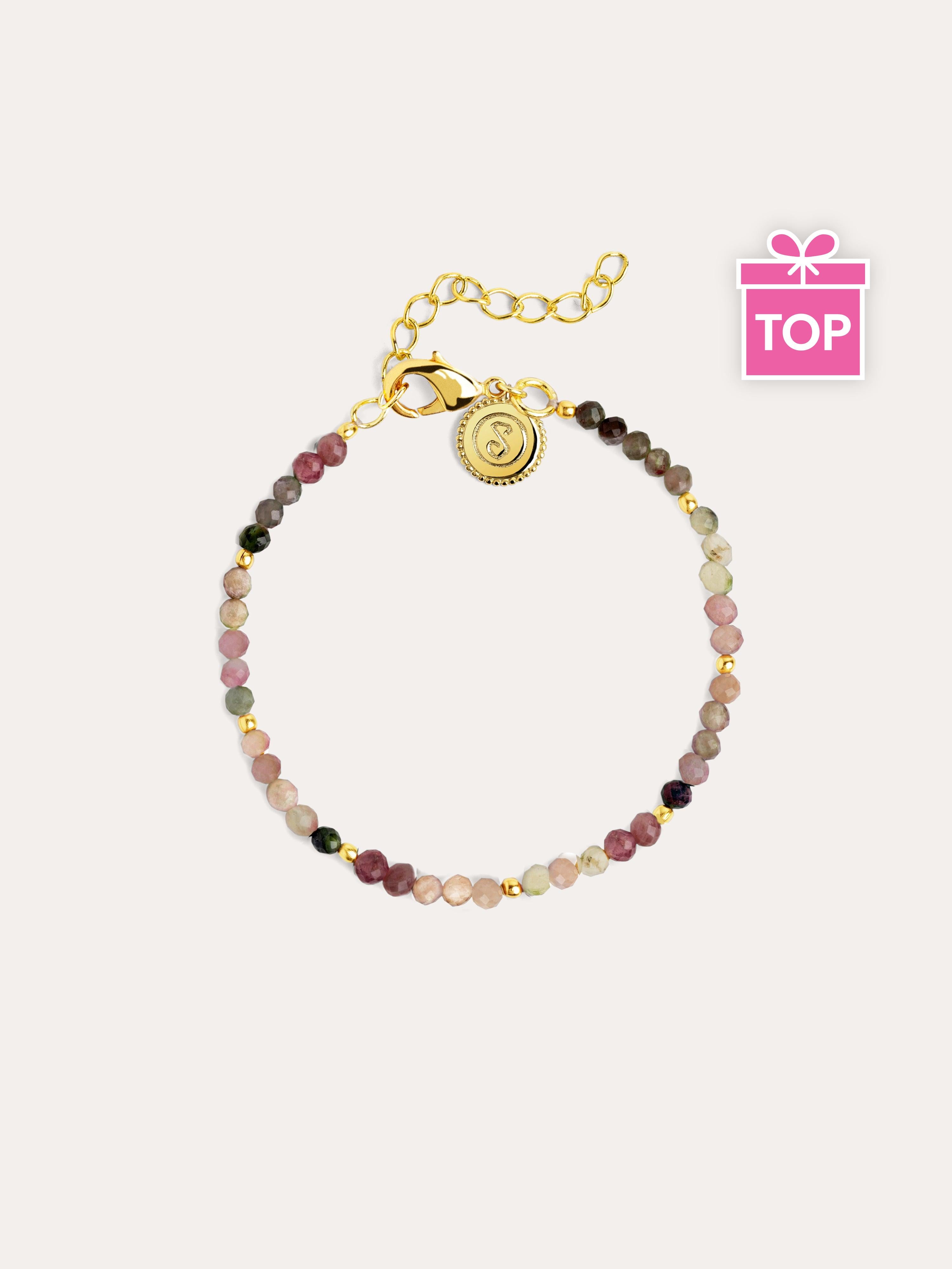 La magia de las piedras naturales ahora en tu muñeca. ✨ Esta pulsera de piedras Turmalina naturales de acero bañada en Oro le dará un toque colorido y boho a todos tus looks.